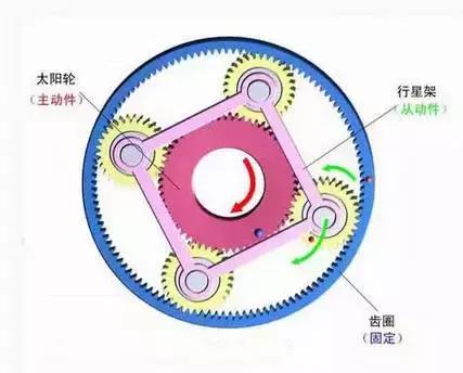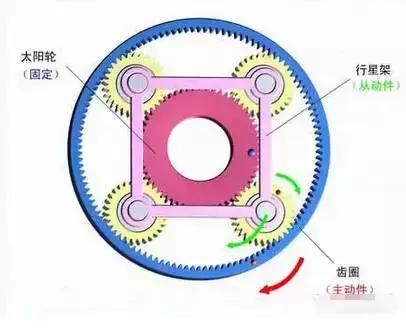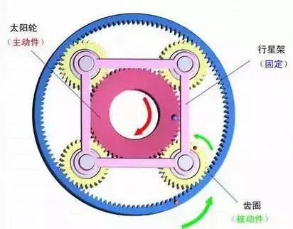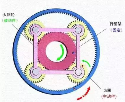 4)太陽輪固定,行星架主動(dòng),齒圈被動(dòng)。