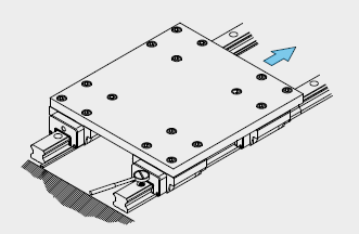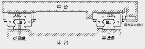 將基準側線軌的兩個滑塊及從動側線軌其中一個滑塊固定于平臺,再將從動側的導軌及其另一個滑塊約略分別固定于床臺及平臺,以基準側導軌為準移動平臺,從導軌一端開始,邊確認從動側直線導軌的滾動阻力,邊依序以特定的扭力鎖緊裝配螺絲。
