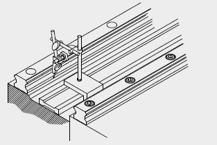 將基準側兩個滑塊固定在一個測定平臺上,而從動側只裝上一個滑塊,其導軌與滑塊都尚未緊固于床臺與平臺,使用附于從動側滑塊頂面千分量表,量測從動側滑塊的側基準面,從導軌的一端開始校準并依序以特定的扭力鎖緊裝配螺絲。