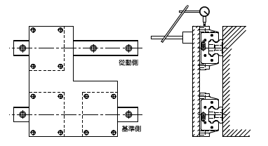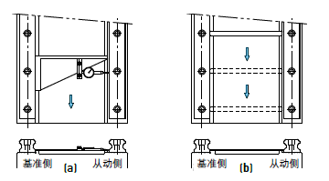 在無固定螺釘的安裝例中為確保從動側導軌與基準側導軌間的平行度,導軌可依下列所示安裝,而滑塊的安裝則與前述范例相同。