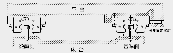在無側向定位裝配面的安裝例中為確保從動側導軌與基準側導軌間的平行度,導軌可依下列所示安裝,而滑塊的安裝則與前述范例相同。