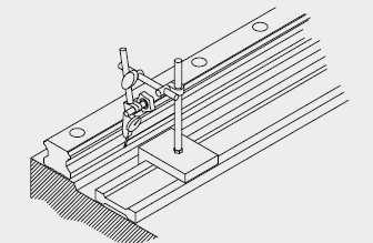 使用兩個滑塊緊密接合固定于測定用平板,依床臺導軌裝配附近的基準面為準,使用千分量表校準基準側導軌之側邊基準面,從導軌的一端開始校準并依序以特定的扭力鎖緊裝配螺絲。