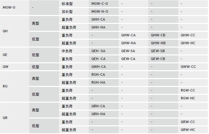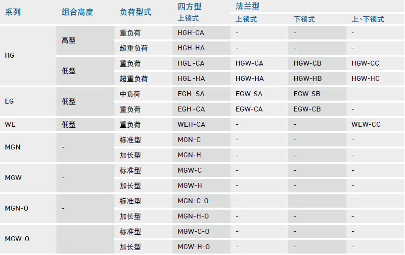 為服務客戶因應其對產(chǎn)品多樣性的需求,除了適用一般工具機產(chǎn)業(yè)的HG系列外,更研究開發(fā)出較適合自動化產(chǎn)業(yè)的EG系列以及適合于單軸設備使用的WE/QW系列;且研究開發(fā)出適合高剛性需求產(chǎn)業(yè)的RG/QR系列及微小型機械半導體產(chǎn)業(yè)適用之MGN/MGW系列;并針對高科技產(chǎn)業(yè)研究開發(fā)出具有高速、寧靜、低發(fā)塵需求的QH/QE系列產(chǎn)品。