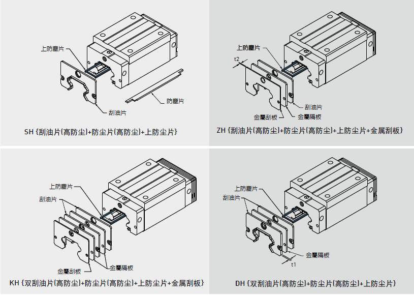 HIWIN特別針對(duì)具有粉塵顆粒之嚴(yán)苛作業(yè)環(huán)境,如木工機(jī)械、玻璃/石墨加工等設(shè)備,開(kāi)發(fā)具有超高防塵功能之特殊配件,實(shí)現(xiàn)超高防塵性能。若有下列高防塵配件需求時(shí),請(qǐng)于產(chǎn)品型號(hào)后面加注代碼。