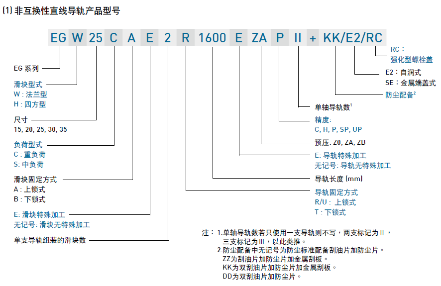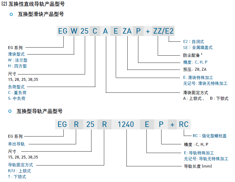 EG系列分為非互換性及互換性型兩種直線導(dǎo)軌,兩者規(guī)格尺寸相同,主要差異點(diǎn)在于互換性型之滑塊、導(dǎo)軌可單獨(dú)互換使用,較便利,但其組合精度無法達(dá)到非互換性型之超精密級以上的精度,不過由于HIWIN互換性型之組合精度目前已達(dá)到一定的水平,對不需配對安裝直線導(dǎo)軌的客戶而言,是一項(xiàng)便利的選擇。直線導(dǎo)軌的產(chǎn)品規(guī)格型號主要標(biāo)明直線導(dǎo)軌尺寸、型式、精度等級、預(yù)壓等規(guī)格要求,以利訂貨時雙方對產(chǎn)品的確認(rèn)。