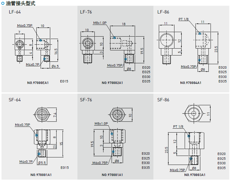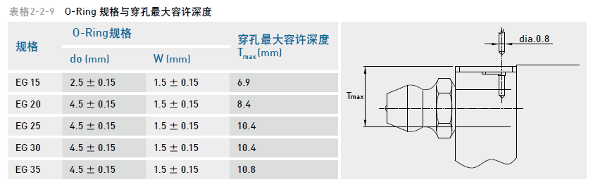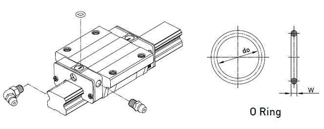 依客戶需要在滑塊前端或后端裝上油嘴以供手動打油,EG系列特別在端蓋側邊預留側油孔位置安裝油嘴(一般為直油嘴),提供側向打油,側向打油的位置建議在非側基準邊,但若有特殊需要亦可放在側基準邊。客戶如有上述側向打油需求請與我們聯絡。EG系列在端蓋頂端亦預留上油孔位置,客戶若欲從端蓋上方供油,須使用直徑0.8mm的金屬針以預熱的方式,在指定位置將上油孔穿通,再將密封環安裝于凹處即可,避免使用鉆頭穿通上油孔,碎屑有污染油道的危險。使用接管方式自動供潤滑油脂之直線導軌,則可依連接管型式選用安裝油管接頭。