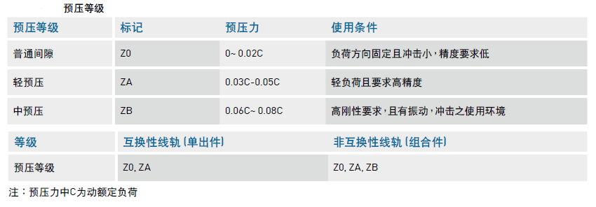 直線導(dǎo)軌的預(yù)壓力:所謂預(yù)壓力是預(yù)先給予鋼珠負(fù)荷力,利用鋼珠與珠道之間負(fù)向間隙給予預(yù)壓,這樣能夠提高直線導(dǎo)軌的剛性和消除間隙。
