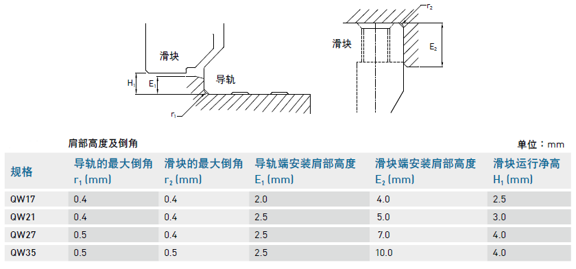 3、安裝注意事項(xiàng), 我們在超導(dǎo)軌的時(shí)候,要注意安裝面肩部高度及倒角,安裝直線導(dǎo)軌時(shí)必須注意安裝面肩部的狀況是否適當(dāng),如倒角過大,凸出的地方易造成直線導(dǎo)軌精度不良,而高度過高則會干涉滑塊。故如果能依照建議要求安裝面肩部,安裝精度不良即可排除。下表為QW靜音安裝面肩部高度及倒角相關(guān)參數(shù)。