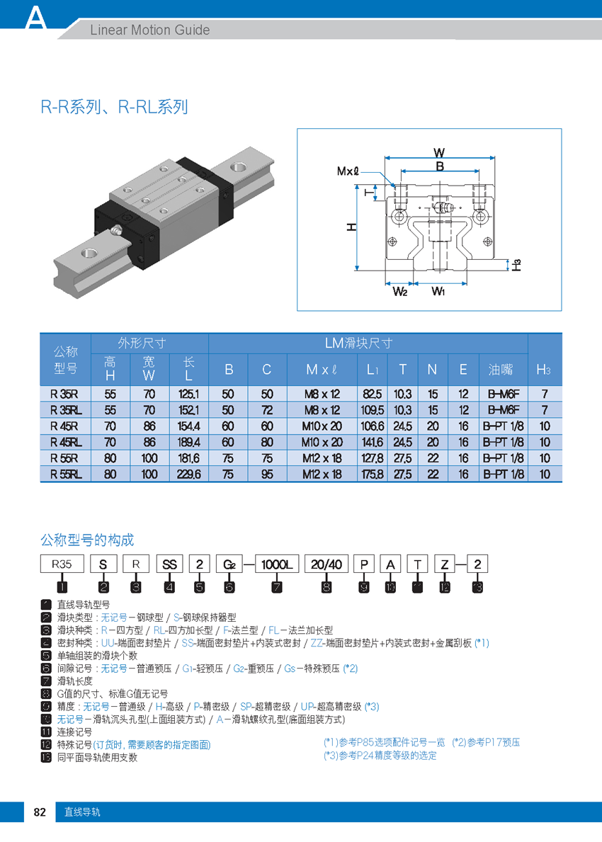f. 與相同尺寸的鋼球型直線導軌相比, 具有更大的基本額定負載, 有利于設備的小型化, 使用相同尺寸也能獲得更長的使用壽命。